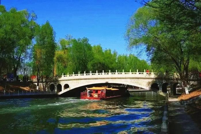 南长河、京密引水渠昆玉段航线从紫竹院公园紫御湾码头乘画舫游船出发,船行水面,水波荡漾,两岸垂柳吐绿。这条航线是北京最古老的游船航线之一,曾是清朝皇室前往颐和园避暑的御用水道,又被称为“皇家御河”。沿途经过万寿寺、广源闸等多处园林、遗址,充满历史文化底蕴。